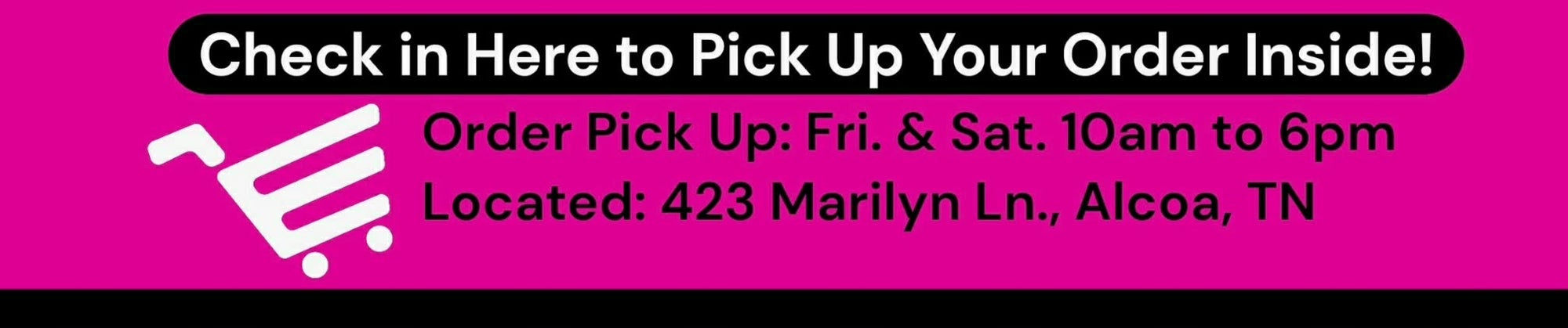 Pick Up Orders will all be at our new location in Alcoa! 423 Marilyn Ln. Alcoa Tn 37701. If you have any questions or need additional assistance please call the store. Pick up dates will be Fri-Sat 10am to 6pm.