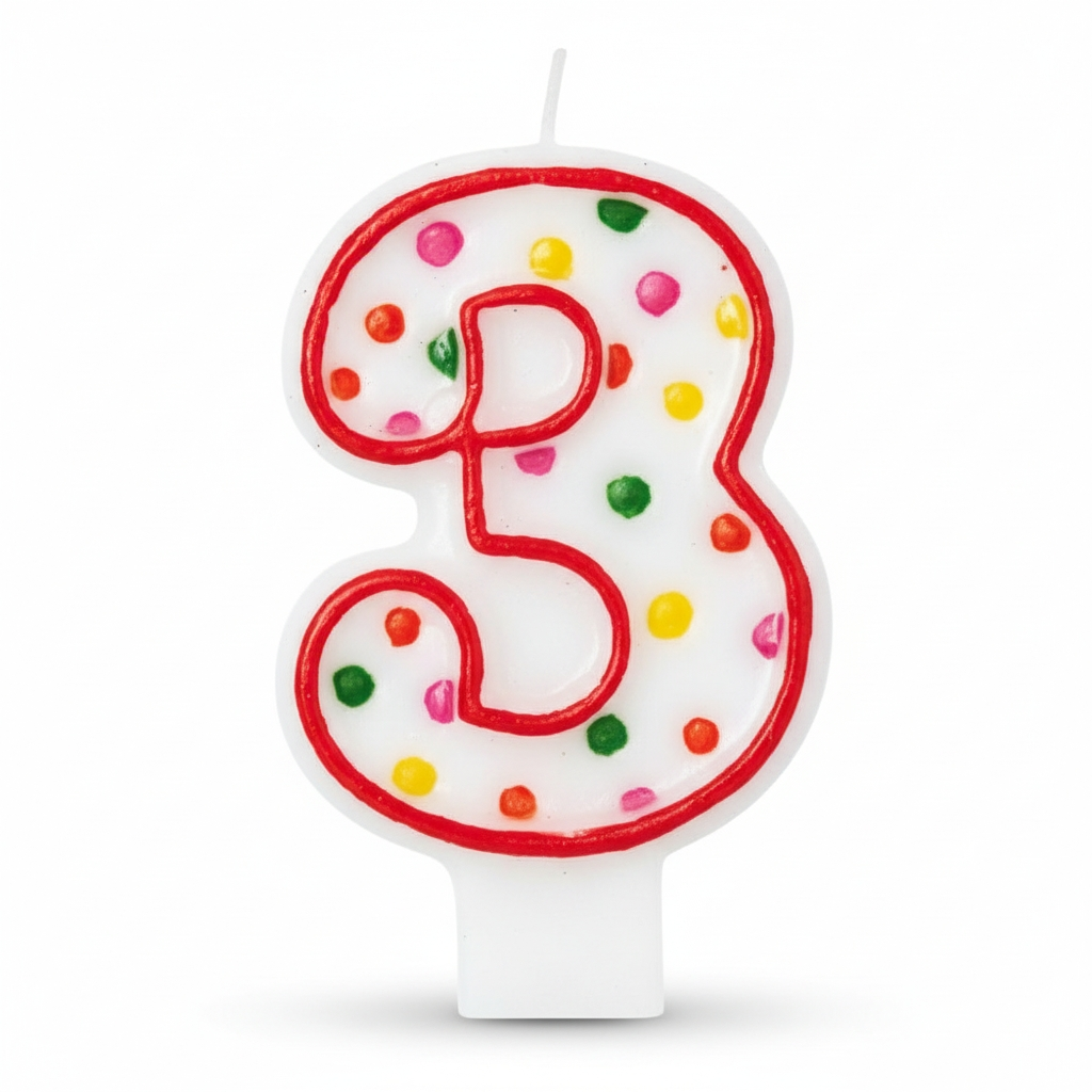 Measures 3 in; Features a fun 3 shape with a red outline and colorful polka dots; Makes any cake look festive and fun; Have a worry-free party! Add our Polka Dots #3 Flat Molded Candle to your party to have a smooth and fun time Why settle for less? Maximize the fun with our high-quality Polka Dots #3 Flat Molded Candle. Grab your supplies from Am scan and make the best out of your party Makes any cake look festive and fun! Because three s a party! Give your celebrant's cake that party look with a colorful Polka Dot #3 candle
