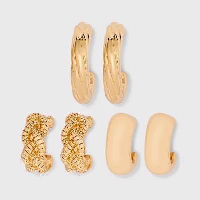 Add different designs to your earring collection with this Braided and Twist Textured Hoop Earring Set from A New Day . This earring set in shiny and matte gold-tone finishes includes three pairs of braided, twist-textured and smooth hoop earrings to give you plenty of options for everyday styling. Made of metal, this set is designed with post-back closures, and the nickel-free construction suits most skin types.Universal Thread : Found exclusively at Target. Highlights: Universal Thread 3pc hoop earrings set Various designs Gold-tone finish Post-back closures Nickel-free metal Specifications: Dimensions (Overall): .49 Inches (L), .21 Inches (W) Weight: .75 Grams Closure Type: Post Suggested Age: 15 Years and Up Count: 3 Pairs Material: Nickel-Free Metal Care & Cleaning: Care Instructions Not Provided