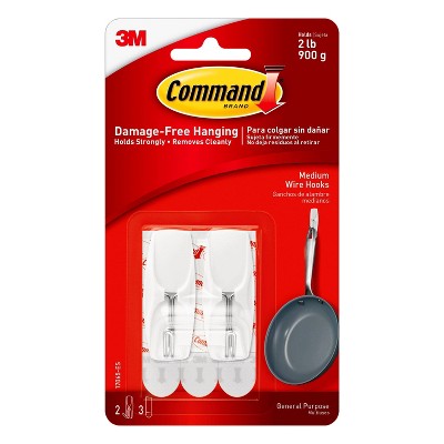 Life is easier when everything has its place. Organize your home damage-free with Command Wire Hooks. Command Hooks let you hang what you want, where you want, without the hassle of tools and nails. Command Strips hold strongly on a variety of smooth, finished surfaces, and these adhesive hooks remove cleanly with no sticky residue or damage left behind. Now you can organize your home or office just the way you want with Command indoor hooks. Highlights: INCLUDES - 2 hooks and 3 medium strips; 1 hook holds 2 lbs ORGANIZE DAMAGE-FREE - Say goodbye to holes, marks, or sticky residue on your walls, doors, cabinets, or closets; Command Hooks by 3M are easy to use and help keep your walls looking beautiful NO TOOLS REQUIRED- Hang calendars, lint brushes, cleaning tools, Christmas decorations, belts, and accessories where you want without nails or a hammer. Includes metal wire toggle feature for versatile hanging STRONG AND VERSATILE- Command Wire Hooks include hold strongly on a variety of indoor surfaces including painted walls, smooth ceilings, finished wood, glass, tile, metal, and other smooth surfaces REMOVES CLEANLY- Reorganize when inspiration strikes; These wall hooks leave no sticky adhesive behind; Perfect to use inside cabinets and closets, in your college dorm, apartment, home, and office Specifications: Dimensions (Overall): .83 Inches (L), 2.17 Inches (H) x .88 Inches (W) Weight: .04 Pounds Holds up to: 2 Pounds Package Quantity: 2 Material: Plastic