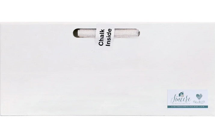 This piece is composed of high-end pine wood and a vinyl chalk application. Wipe with water and reuse as many times as you want. Each piece comes with a piece of chalk which can be stored in the back. Display this fun and functional tabletop piece in your home and watch the smiles grow. Dimensions are 5.5 x 12 x 1.25. Product weight 20 oz. Proudly designed, made, and printed in the USA with solid wood, by Sincere Surroundings.