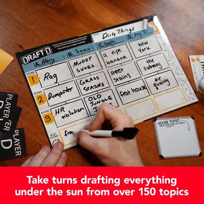It s a party game where players take turns drafting everything! Choose from over 150 topics that range from the ultra-specific weapons for a zombie apocalypse to weirdest thing you d like to be covered in and everything in between. Compete against your friends and get ready to debate your picks. Not all #1 drafts will lead to first place! See how well you know your friends and find out some secrets along the way. Spin Master brings the fun home by offering a range of games for adults, card games for adults, adult games, kids toys & games including baby toys, toys for girls, and board games. Collect your favorite stuffed animals, fidget toys, RC cars, action figures, dolls & accessories and more. From special gifts for men to baby & toddler toys for kids at heart, make your birthday gifts a breeze by shopping our diverse catalog selection. Still hungry for more, explore kids games, pool toys, outdoor games, and monster trucks for any time of the year. Get creative with arts and crafts, building toys and RC cars and take the action to the table with jigsaw puzzles for adults or card games. Includes 1 Players Pick Boards, 2 Dry Erase markers, 1 Draft Commissioner Board, 100 Cards, 1 House Topic Card, instructions Highlights: Go beyond sports drafting with Draft d Party game for people who love fantasy drafting Choose favorite smells & more! Judge chooses top 3 things to draft Players pick drafts that they think the judge like Don t get the bust or you re out! For 3+ players For ages 14+ Specifications: Suggested Age: 14 Years and Up Type of Game: Party Games Playing Time: 15 Minutes or More Number of Players: 3 or More Players Educational Focus: Creative Thinking Includes: Dry Erase Markers, Cards, Boards, Instructions Package type: Full Game Battery: No Battery Used