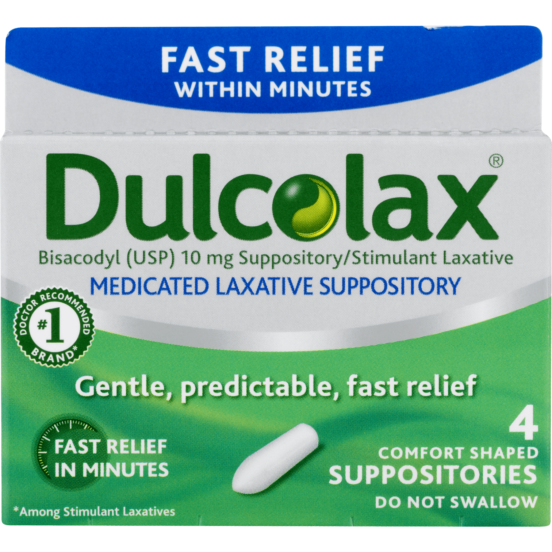 Constipated? Time's up. Dulcolax Medicated Laxative Suppositories can help get you going in 15-60 minutes. These comfort-shaped suppositories are medicated with active ingredient bisacodyl for fast relief in minutes. As with any suppository, Dulcolax medicated suppositories are for rectal use only; do not swallow. Looking for relief in 6-12 hours? Try Dulcolax Stimulant Laxative Tablets for gentle relief. Trust the No. 1 doctor-recommended stimulant laxative brand* for relief when you need it most.m * Among OTC Stimulant Laxatives HSA/FSA Eligible Includes: One (1) 4-count box of Dulcolax Medicated Laxative Suppositories Fast relief: These suppositories provide reliable and fast relief in 15-60 minutes For rectal use only: Dulcolax comfort-shaped suppositories are for rectal use only; do not swallow Active ingredient bisacodyl: Dulcolax Medicated Suppositories are made with bisacodyl, which helps increase movement in the intestines #1 doctor recommended: Dulcolax is the No. 1 doctor-recommended laxative brand* *Among OTC Stimulant Laxatives Concern: Gas & Constipation Relief Form: Suppository KeyIngredient: Not Applicable ProductType: Laxative Suppositories Quantity: 1-10 CT DIRECTIONS: Adults and children 12 years of age and over: 1 suppository in a single daily dose. Peel open plastic. Insert suppository well into rectum, pointed end first. Retain about 15 to 20 minutes; Children 6 to under 12 years of age: 1/2 suppository in a single daily dose; Children under 6 years of age: ask a doctor. DIRECTIONS: Adults and children 12 years of age and over: 1 suppository in a single daily dose. Peel open plastic. Insert suppository well into rectum, pointed end first. Retain about 15 to 20 minutes; Children 6 to under 12 years of age: 1/2 suppository in a single daily dose; Children under 6 years of age: ask a doctor.