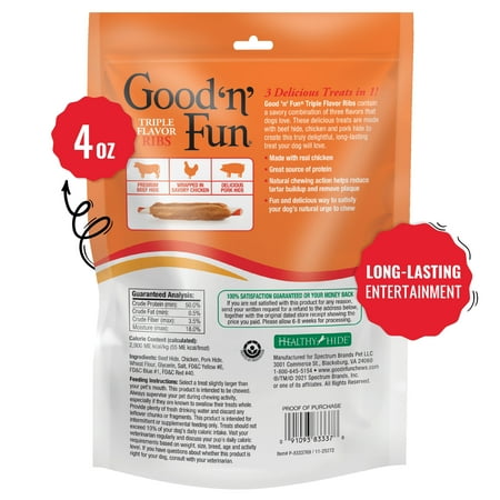 THREE FLAVORS DOGS LOVE: Made from pork and beef hides, then wrapped with real, premium chicken. LONG-LASTING: Good n Fun Triple Flavor Ribs are truly delightful, long-lasting beef hide treats your dog will love. HIGH IN PROTEIN: Perfect to give your dog every day for a chew full of fun and flavor. NATURAL CHEWING ACTION: Promotes clean teeth from the natural action of chewing. TRIPLE FLAVOR RIBS: Wrapped with premium chicken for a taste canines crave. Kennel tested and preferred 38 to 1 over other combination dog chews Four ounces of triple-flavor 5 Inch ribs with premium beef and pork hide twist wrapped in savory chicken