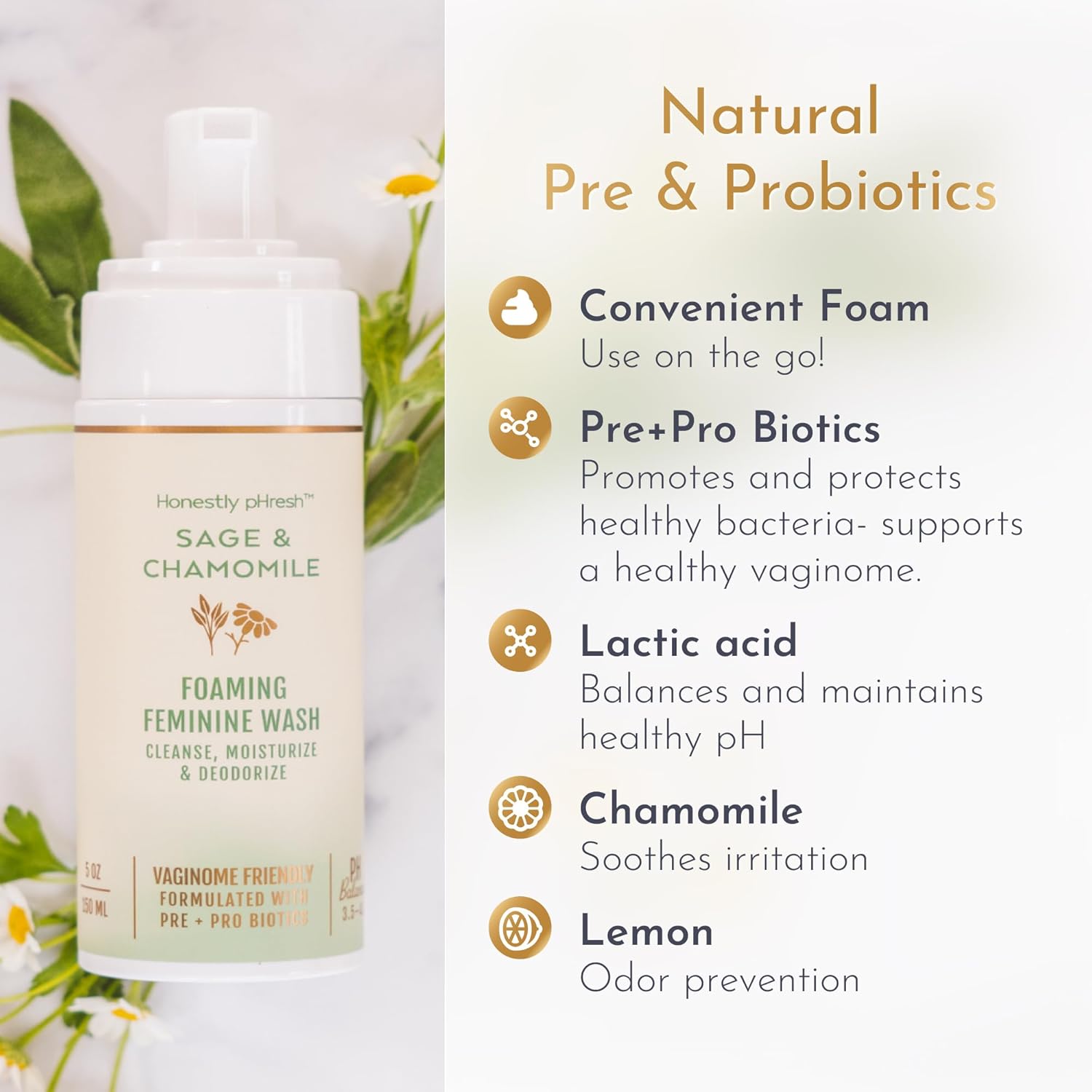 Sensitive Unscented Foaming Feminine Wash. Cleanse, Moisturize & Deodorize. Formulated With Pre - Pro Biotics. Cruelty Free Vegan. Made in USA. Made For Women, By Women. Our unique foaming formula is packed with pre + probiotics as well as lactic acid to maintain the perfect pH level of your delicate area and to combat odor before it starts.