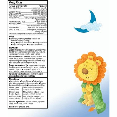 Soothe your child's cold and cough symptoms with Hyland's 4 Kids Cold & Cough Night Time Liquid. This homeopathic formula provides safe and effective relief from sneezing, runny nose, cough, congestion, and other common cold symptoms. Made with natural active ingredients, including honey and chamomile, it helps calm and comfort your child for a restful night's sleep. Whether your child is struggling with a cold or flu, Hyland's Night Time Liquid offers gentle, non-drowsy relief without the risk of side effects or drug interactions. With its great-tasting formula and easy-to-administer dosing, it's suitable for children ages 2 years and older. Trust Hyland's for quality children's cold and cough relief that helps your little one feel better fast. Highlights: Nighttime Cold Relief: Provides effective relief from common cold symptoms, including cough, congestion, and sore throat, helping children sleep. Decongestant & Sore Throat Relief: Eases nasal congestion, runny nose, and soothes sore throats for a more comfortable night. Safe for Ages 2+: Specially formulated for children 2 years and older, offering safe and gentle relief. Natural Active Ingredients: Made with natural, homeopathic ingredients to gently relieve symptoms without harsh chemicals. 4 fl oz Bottle: Convenient size for nighttime relief during cold and flu season. Specifications: Trial/Mini/Travel Size: Yes Suggested Age: Adult Product Warning: Keep out of reach of children, consult a doctor if you are pregnant or nursing Product Form: Liquid Primary Active Ingredient: No Active Ingredient Net weight: .37 ounces Package Quantity: 1
