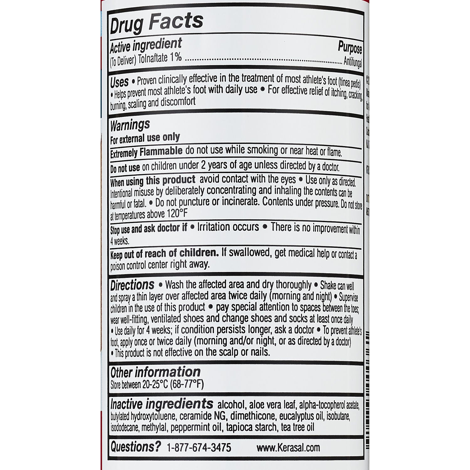 Get multi-symptom relief from athlete's foot with Kerasal 5-In-1 Athlete's Foot Invisible Powder Spray. This anti fungal spray is the 5-in-1 athlete's foot solution that not only cures most athlete's foot while treating symptoms, but also prevents recurrence and nourishes skin. Formulated with tolnaftate and enriched with natural tea tree oil, aloe, ceramides, vitamin E and essential oils, this spray delivers the symptom relief of an athlete's foot spray with the anti fungal properties of prescription strength treatment. It is also a deodorizer with a special blend of essential oils. Multi-symptom relief 5-in-1 athlete's foot solution A blend of essential vitamins to care for your feet Concern: Foot Health Form: Mist & Spray ProductType: Skin Treatments Quantity: 1-20 OZ Symptom: Not Applicable Wash the affected area and dry thoroughly. Shake can well and spray a thin layer over affected area twice daily(morning and night). Supervise children in the use of this product. Pay special attention to spaces between the toes; wear well-fitting, ventilated shoes and change shoes and socks at least once daily. Use daily for 4 weeks; if condition persists longer, ask a doctor. To prevent athlete's foot, apply once or twice daily(morning and/or night, or as directed by a doctor). This product is not effective on the scalp or nails. Wash the affected area and dry thoroughly. Shake can well and spray a thin layer over affected area twice daily(morning and night). Supervise children in the use of this product. Pay special attention to spaces between the toes; wear well-fitting, ventilated shoes and change shoes and socks at least once daily. Use daily for 4 weeks; if condition persists longer, ask a doctor. To prevent athlete's foot, apply once or twice daily(morning and/or night, or as directed by a doctor). This product is not effective on the scalp or nails.