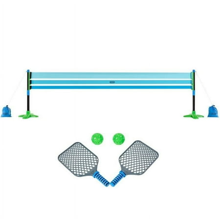 10-foot-wide net with ripstop nylon bands Net height adjusts from 24 up to 34 Includes 2 paddles & 2 balls Includes 2 nylon tension bags for added stability Easy set up to play Breaks down for storage Easy to transport for play on the go. Ages 3+.