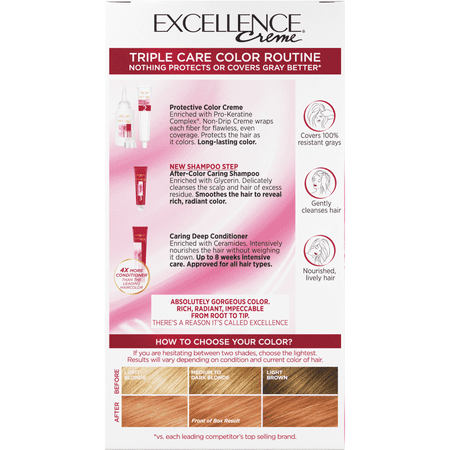L'Oreal Paris Excellence Creme Permanent Hair Color, 8RB Medium Reddish Blonde L'Oreal Paris Excellence Creme hair color offers 100 percent gray coverage for all hair types, even on the most stubborn grays Your Excellence just got better, New Triple Care Color routine protects before, during, and after coloring for up to eight weeks, new look with the same great shades Protects hair three ways with a combination of ceramide, pro-keratine, and glycerin that results in rich, radiant color and revitalized hair New salon inspired after color shampoo enriched with Glycerin to delicately cleanse the scalp and hair of excess residue, Smoothes the hair to reveal rich, radiant color Excellence exclusive non-drip creme for rich, radiant, absolutely gorgeous hair color from root to tip.