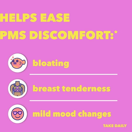 Tell PMS to Peace Out: Midol Supplements Peace Out PMS helps ease mild mood changes Formulated With Chasteberry: Formulated with a scientifically proven level of chasteberry extract to help relieve bloating, breast tenderness, and mild mood changes Vegan Formula: Midol Supplements Peace Out PMS is free from gluten, GMOs, no artificial sweeteners, no artificial flavors, no artificial colors Drug-Free: Also includes ginger powder and valerian extract Recommended Use: Take daily for 3 months and beyond Help Ease Mild Mood Changes: PMS mood support with Chasteberry extract This statement has not been evaluated by the Food and Drug Administration. This product is not intended to diagnose, treat, cure, or prevent any disease.