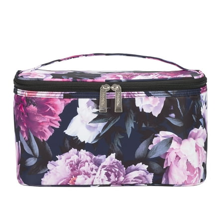 Decorated with floral design Classic style with a simple and elegant shape Great for daily use or travel Makeup mirror attached on the lid Spacious lower compartment Single top handle Coil zipper with metal pullers Made of polyester Fully lined Wipeable lining