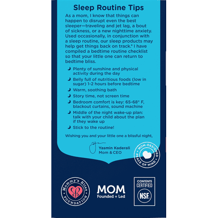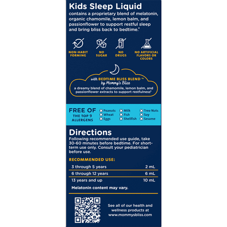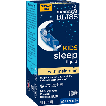 Mommy's Bliss With melatonin and claiming herbs to support your child s natural sleep process Natural grape flavor Non-habit forming Sugar free Free of the top eight allergens