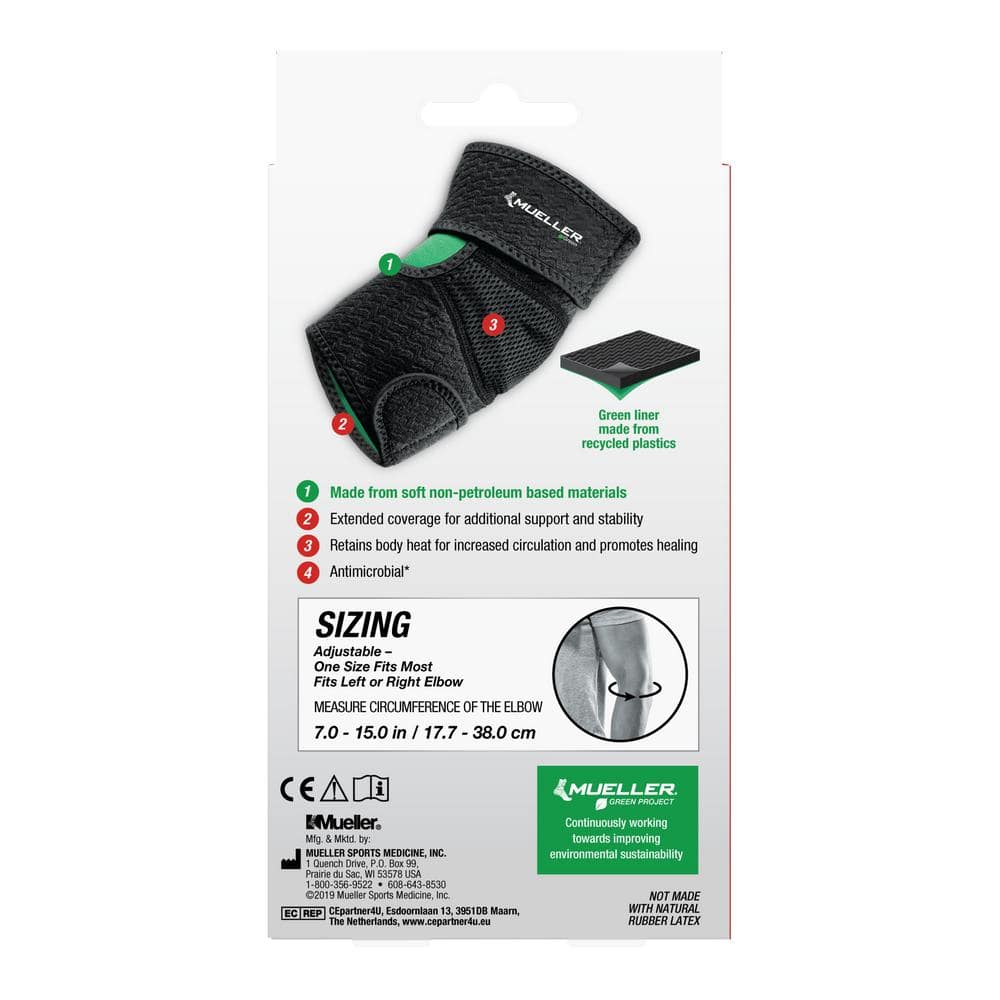 The Adjustable Elbow Support helps provide support and compression to the elbow and provides support to weak, injured or arthritic elbows. Made with earth-friendly recycled materials. Brace made with limestone-based neoprene. Green liner made of 67% recycled PET bottles.. Product Weight (lb.): 0.260 lb. Returnable: 90-Day. Product Height (in.): 7.125 in. Product Length (in.): 1.750 in. Product Width (in.): 3.750 in