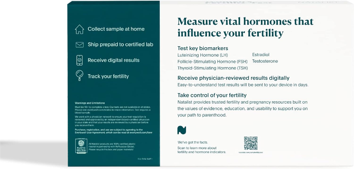 TEST KEY BIOMARKERS The Natalist Women s Fertility Test powered by Everlywell provides insight into key hormones that impact your reproductive health. The test kit measures five hormones that influence your fertility: estradiol, luteinizing hormone (LH), follicle-stimulating hormone (FSH), thyroid-stimulating hormone (TSH), and total testosterone. CLIA CERTIFIED & PHYSICIAN-REVIEWED Each partner lab we choose to work with is CLIA-certified (Clinical Laboratory Improvement Amendments). Everlywell tests are reviewed and approved by an independent board-certified physician within your state. Not available in New York. Test taker must be 18+. PROTECTING MOTHER EARTH All Natalist products and packaging are 100% plastic neutral; for every pound of plastic we sell, we facilitate the removal of a pound of plastic pollution giving your purchase a net-zero plastic footprint. CONVENIENT, AT-HOME TEST WITH EASY-TO-UNDERSTAND RESULTS Includes everything you need for collection (only a small amount of blood is needed as a sample). The prepaid shipping label included with the test makes it easy to send your sample to the lab for analysis. You'll get your test results on our secure online platform up to 5-8 days after the lab receives your sample, along with access to a live webinar led by a healthcare professional. ABOUT THE BRAND Natalist is a team of moms and doctors that offers fertility, pregnancy, and postpartum essentials that are science-backed and designed with sustainability in mind. We take the guesswork out of reproductive health with thoughtfully designed products to support you on every step of your fertility health and reproductive journeys.