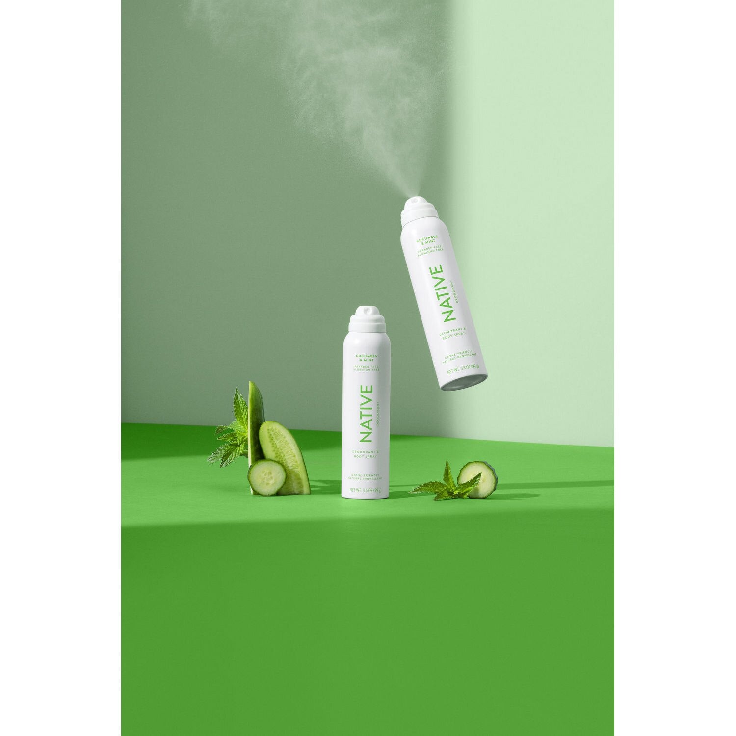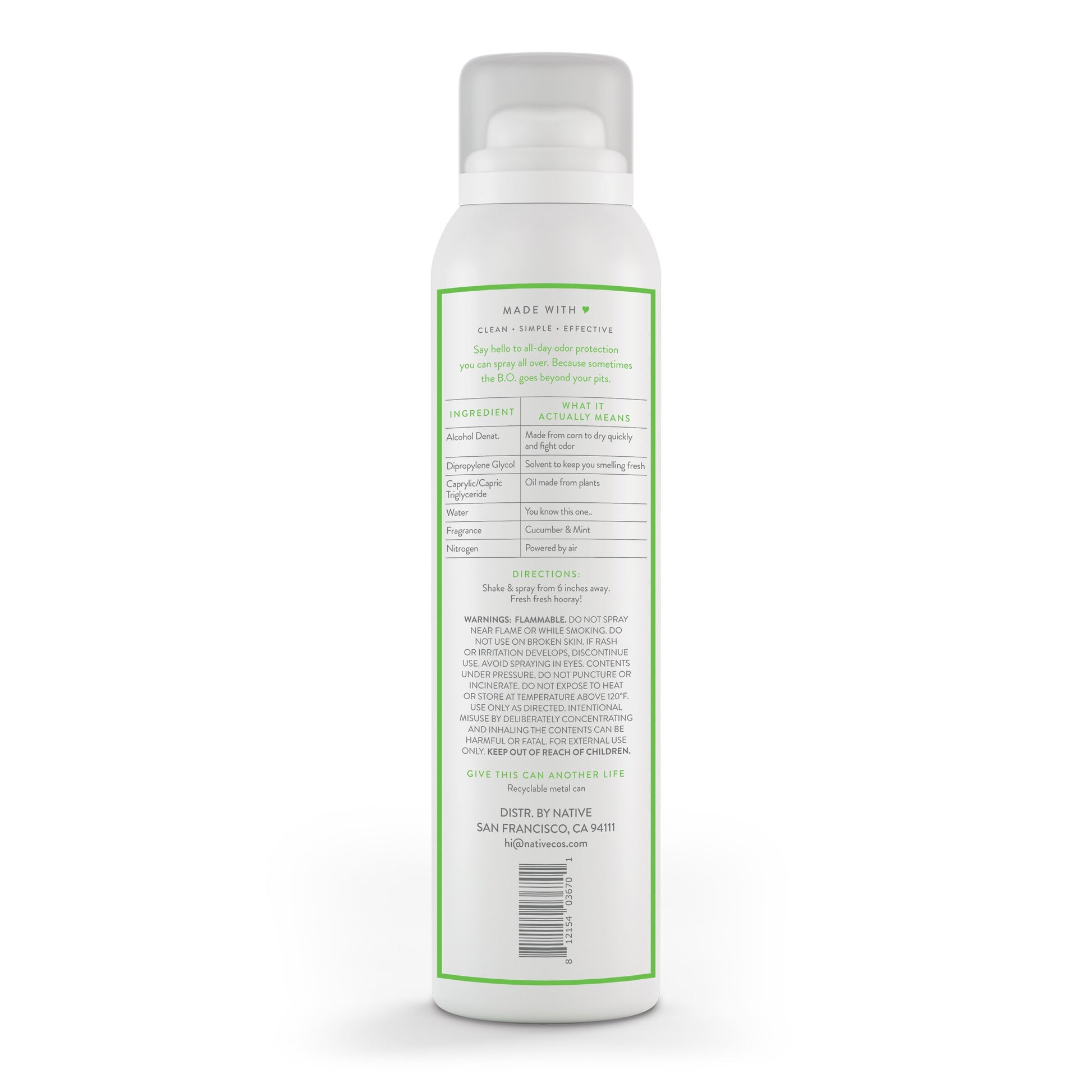 Introducing a new way to experience Native. Everything you love about our stick deodorants sublimated (solid becoming vapor, what's up high school chem!) into an ozone-friendly natural propellant spray. All-day odor protection and all-over-your-body freshness in some of our most loved scents and a light mist that applies like a dream. Sublime, wouldn't you say? Our formulas have nothing extra added, but have everything covered. We believe that less is more. That's why we thoughtfully selected each ingredient in our deodorant and body spray. Start with the obvious ones, like water and fragrance, and add our plant-oil-derived skin conditioning ingredient (Caprylic/Capric Triglyceride), Dipropylene Glycol to keep the freshness engine revved all day, and denatured alcohol made from plants for fast-drying with no arm-flapping required. Last up, our natural propellant, our air-powered nitrogen. This is all-day body odor protection you don't have to think about, made with ingredients you (and the planet) don't have to worry about. And like all our deodorants, our deodorant sprays are aluminum and paraben-free and will have you asking for more. Get all-over body odor protection with plant-oil-derived skin conditioning ingredients Applies light as air as a cooling and fast-drying mist that leaves you smelling great and feeling fresh Native Deodorant uses natural ozone-friendly propellants with no hydrocarbons, and is powered by nitrogen This 3.5 oz of deodorant and body spray comes packaged in a recyclable metal canister This Cucumber and Mint product is aluminum-free and paraben-free You can also get this spray deodorant in Coconut and Vanilla, Eucalyptus and Mint, Lilac and White Tea, Sea Salt and Cedar and Sweet Peach and Nectar scents Concern: Odor Control Form: Mist & Spray ProductType: Deodorant Quantity: Single Pack Scent: Herbal SkinType: All Skin Types Please follow as instructed on the product label. Please follow as instructed on the product label.