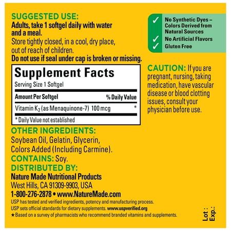 Bone support supplement: contains one 30 count bottle of Nature Made Vitamin K2 100 mcg Softgels for a 30-day supply These Nature Made Vitamin K2 softgels help support healthy bones This K2 Vitamin supplement also works with the calcium in your body to support healthy bones Adults, take one Vit K softgel daily with water and a meal Sourced from high-quality ingredients, these gluten free Vitamin K2 MK7 supplements contain no synthetic dyes and no artificial flavors United States Pharmacopeia (USP) Verified, #1 Pharmacist Recommended Vitamin & Supplement Brand* These statements have not been evaluated by the Food and Drug Administration; this product is not intended to diagnose, treat, cure, or prevent any disease