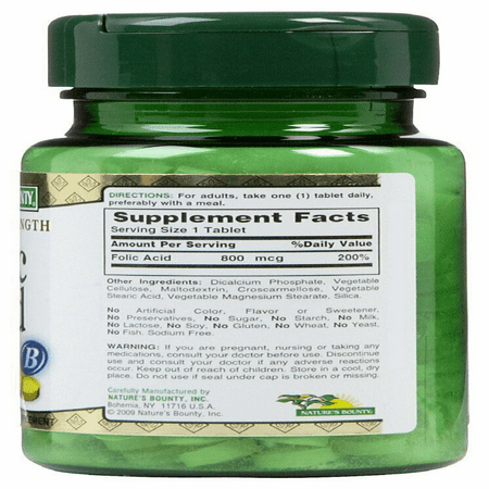 Nature's Bounty Folic Acid 800 mcg, 250 Tablets: Promotes Cardiovascular Health* Nature's Bounty Folic Acid is Suitable for Vegetarians. Non-GMO These tablets are Gluten Free. No Preservatives *This statement has not been evaluated by the Food and Drug Administration. This product is not intended to diagnose, treat, cure or prevent any disease.