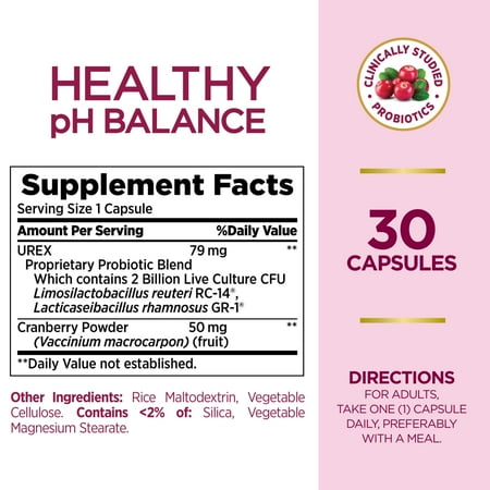Nature's Bounty Optimal Solutions Healthy pH Balance Womens Vitamins Probiotics Pills for Vaginal Health, 30 Capsules Women-Specific, Clinically Studied Probiotics Probiotics to promote a healthy balance of good bacteria & vaginal health. Features probiotics critical for vaginal health and pH balance With two women-specific strains of probiotic species: Lacticaseibacillus rhamnosus GR-1 and Limosilactobacillus reuteri RC-14 One-Per-Day formula for convenient use Infused with Cranberry Powder *These statements have not been evaluated by the Food and Drug Administration. This product is not intended to diagnose, treat, cure or prevent any disease Source: Circana Total US Multi Outlet: Latest 52 weeks ending 1/7/24