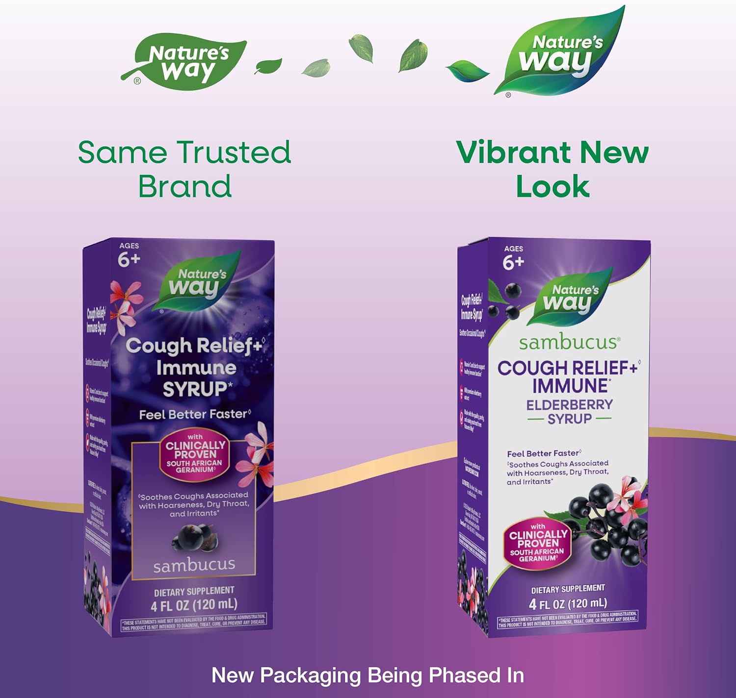 Nature s Way Sambucus Cough Relief +(1) Immune* Elderberry Syrup unites South African Geranium root extract with vitamin C and zinc to support immune health.* (1)South African Geranium root extract soothes occasional coughs associated with hoarseness, dry throat, and irritants, and reduces the duration and severity of minor nasal, throat, and chest irritations.* For best results, use at first sign of minor cough, nasal, throat, or chest irritations and continue to use for an additional 48 hours after irritations cease. Children ages 6-12, take 1 1/2 TSP three times daily. Adults and children ages 13+, take 2 TSP three times daily. Gluten-free and vegan. No wheat, peanut, dairy, or artificial colors. At Nature s Way, we believe nature is the ultimate problem solver. For over 50 years, we have looked to the natural world for inspiration. Our quality vitamins and supplements are formulated to help you find your way to wellness.