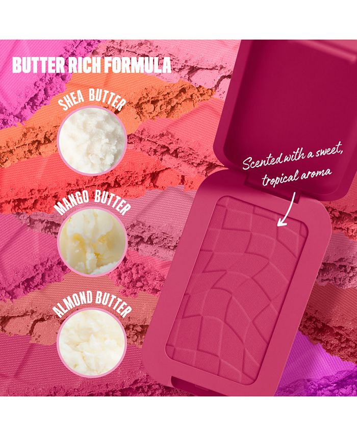 Discover Buttermelt Blush by NYX Professional Makeup! Twelve shades of buttery smoothness that blend like powder, glide like butta in matte or glowy finishes! WHAT IT IS:. A blush with booming pigment, butta blend and butta wear. WHAT IT DOES:. Blends seamlessly like a powder and glides like butta; soft matte and glowy finishes; up to 12 hours of pigmented wear; fade and transfer resistant. INGREDIENT HIGHLIGHTS:. Infused with mango butter, almond butter and shea butter, it doesn't get any butta than this. HOW TO USE:. Lightly tap your brush into the pan to pick up pigment, then swirl the brush on the high points of your cheek, around the temples and even across the nose for a warm flush of blush. Layer over Buttermelt Bronzer (sold separately) for a warm natural sun-soaked bronzed look and make it butta together