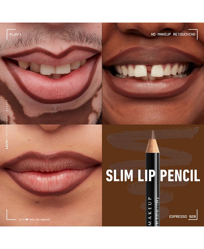 The best-selling NYX Professional Makeup Slim Lip Pencil is a creamy long-lasting lip liner that makes lip shaping & coloring easier than ever! WHAT IT DOES:. Creamy lip liner pencil that applies smoothly and is easy to blend . This long lasting lip liner does not tug, feather, bleed or fade . The Slim Lip Pencil hydrates and conditions dry lips while increasing the wear and intensity of your lip color . Bring shape and definition to your pout by lining lips with this holy grail lip pencil, or achieve a fuller lip look by overlining lips just above the natural lip line to get a plump, perfectly defined pout . Available in many highly pigmented shades from orange to nude liner to traffic-stopping red lip liner. INGREDIENT HIGHLIGHTS:. Enriched with moisturizing coconut oil; cruelty free . HOW TO USE: . Line upper and lower lips as desired. For a fuller lip look, overline lips just above the lip line with the Slim Lip Pencil. . USE WITH: . Any NYX Professional Makeup lipstick or lip gloss to complete your gorgeous lip look. Sharpen this lip pencil with any regular pencil sharpener.. Clean ingredients: formulated without parabens, sulfates, mineral oils, silicone, petroleum & phthalates.