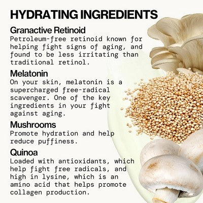 Sleep pretty knowing Pacifica s Wake Up Beautiful Retinoid Cream is working over-time. This light-as-a-pillow, nighttime moisturizer is packed with potent ingredients to help hydrate and repair skin while you sleep. Our RestLab ComplexTM combines a powerhouse of ingredients to address signs of aging and hydrate skin so that you can wake up feeling and looking beautiful. KEY INGREDIENTS:Retinoid: Petroleum-free retinoid known for helping fight signs of aging, and found to be less irritating than traditional retinol.Melatonin: In your body, melatonin makes you sleepy. On your skin, melatonin stimulates the production of antioxidant enzymes while you sleep to protect against free radicals from pollution + UV rays. Mushrooms: Promote hydration and help reduce puffiness.Quinoa: Loaded with antioxidants, which help fight free radicals, and high in lysine, which is an amino acid that helps promote collagen production. FORMULATED WITHOUT:Parabens, phthalates, mineral oil, silicones, or petroleum.PACIFICA PROMISE:Always 100% vegan & cruelty-free made with compassion for the planet, animals & you.HOW TO USE:Best used on clean skin. Apply before bedtime. Do not rinse.GOOD FOR: All skin types, especially dry and combo skin.CARE CAUTION: While Granactive Retinoid is less irritating than retinol, if irritation occurs, discontinue use. For external use only. Avoid contact with eyes. Keep out of reach of children. If pregnant or nursing, consult your doctor before use. Use sunscreen daily as retinol can increase sun sensitivity. Store in a cool, dry place.BETTER PACKAGING:Packaging switched from plastic to paper, aluminum, steel, or glass. Packaging contains recycled content - Glass Jar, 100% PCR (Post Consumer Recycled) Plastic Cap Highlights: All Skin Types, Especially Dry and Combo Skin Petroleum-Free Retinoid Stimulates New Cell Production Helps Reduce Puffiness Repair Skin While You Sleep 100% Vegan Cruelty Free Made in USA with global ingredients Specifications: Scent: Floral Health Facts: Contains Retinoids, Phthalate-Free, Vegan, Paraben-Free, Contains Vitamin E, Sodium Lauryl Sulfate-Free, Sulfate-Free Product Form: Cream Sustainability Claims: Cruelty-Free, Not Tested on Animals, Recyclable Beauty Purpose: Anti-Aging, Soothing, Hydrating Recommended Skin Type: Normal, Mature Net weight: 1.7 fl oz (US)