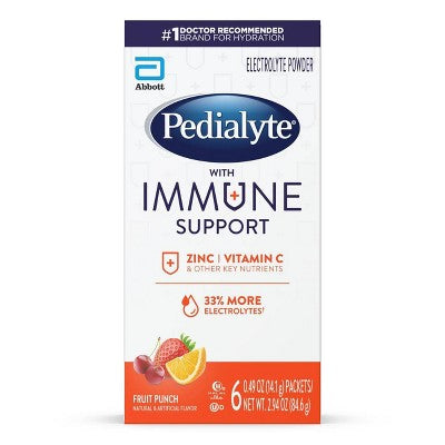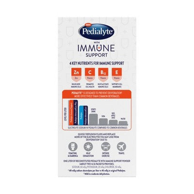 NEW! Pedialyte with Immune Support is advanced hydration from the #1 doctor recommended brand, with 4 key nutrients to support your immune system: zinc to help build new immune cells, vitamin C to promote cell health, vitamin B12 to activate immune cells, and vitamin E to support cell membranes. * 60 mEq sodium electrolytes per liter vs 45 mEq in original Pedialyte. eligible in Similac WIC-contracted states, in-store only; **The WIC (Special Supplemental Nutrition Program for Women, Infants, and Children) and SNAP (Supplemental Nutrition Assurance Program) names are service marks of the U.S. Department of Agriculture. USDA does not endorse any goods, services, or enterprises. Highlights: HYDRATION WITH IMMUNE SUPPORT: 4 key nutrients for immune support: zinc, vitamin C, vitamin B12, and vitamin E 33% MORE ELECTROLYTES*: Advanced hydration to replenish what s lost due to vomiting or diarrhea FROM THE #1 BRAND: Pedialyte is the #1 doctor recommended brand for hydration DIGESTIVE HEALTH: With PreActiv Prebiotics to promote digestive health 100% DAILY VALUE OF VITAMINS C & B12 PER SERVING: Has vitamin C to promote cell health and vitamin B12 to help activate immune cells Specifications: Suggested Age: 1 Year Product Form: Powder Primary Active Ingredient: Electrolyte Powder Package Quantity: 6 Net weight: 2.94 Ounces