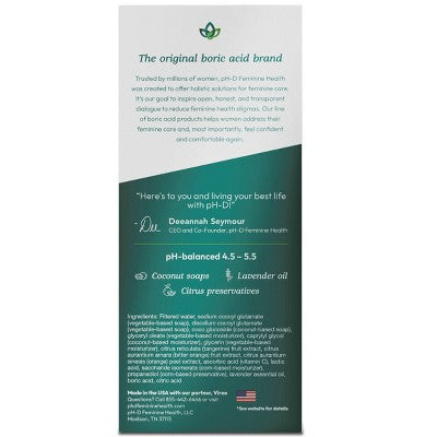 pH-D Boric Acid Vaginal Foam Wash is gynecologist recommended. It is specially formulated to match the pH of the vulva, unlike other foam washes. Cleanse your whole body including your most sensitive areas. pH-D Boric Acid Vaginal Foam Wash is pH-balanced, paraben free, and plant-based. Ingredients: Water, decyl glucoside, propanediol (corn-based preservative), coco glucoside (coconut-based soap), glyceryl oleate (vegetable-based moisturizer), caprylyl glycol (coconut-based moisturizer), glycerin (vegetable-based moisturizer), citrus reticulata (tangerine) fruit extract, citrus aurantium sinesis (orange) peel extract, ascorbic acid (Vitamin C), lactic acid, citric acid, terasodium glutamate diacetate, saccharide isomerate (corn-based preservative), potassium sorbate, sodium benzoate, Lavandula angustifolia (lavender) oil, and boric acidInstructions: Lather a small amount in your hand and apply externally while bathing or showering. Clean from front to back and rinse well. For best results, you can cleanse once or twice a day while bathing or showering.Warning: For external use only. Avoid contact with eyes or mouth. Discontinue use if redness or irritation occurs. Highlights: NEW and IMPROVED PUMP A GAME CHANGER: Effective and safe for everyday use and to wash away odor causing bacteria. pH BALANCED: pH-D Boric Acid Foam Wash is pH-Balanced for your most sensitive areas PLANT BASED: with essential oils and plant-derived ingredients, vegan, paraben free, sulfate-free, and cruelty-free. WOMEN OWNED: pH-D Feminine Health is the only certified women owned brand in the feminine care category QUALITY YOU CAN TRUST: pH-D is the only brand that OWNS and OPERATES their own manufacturing facility to ensure the highest safety standards. Made with quality ingredients in the USA. PROVEN RESULTS: pH-D has been used by millions of women Specifications: Health Facts: Paraben-Free, Phthalate-Free, Sulfate-Free, Hypoallergenic Product Warning: Keep out of reach of children Product Form: Liquid Primary Active Ingredient: Boric Acid Package Quantity: 1 Net weight: 6 fl oz (US) Features: May Relieve Discomfort