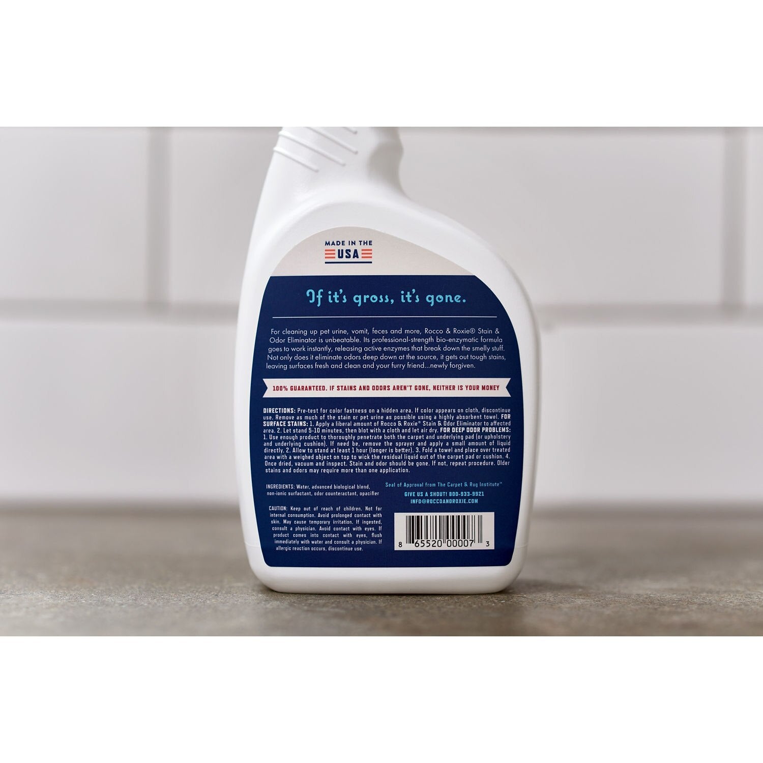 Our Professional Strength Bio-Enzymatic formula virtually eliminates any stain and odor from urine, feces, vomit, and other organic stains. Discourages pets' attraction to stained areas by making odors disappear while removing stains from carpeting, rugs or upholstery. Use it for more than just carpets and upholstery. You will love using it to freshen up pet bedding, litter boxes, travel crates, hamster cages, automobiles, campers, laundry, etc. We have earned the Seal of Approval from the trusted Carpet and Rug Institute (CRI). Beware of products without the CRI Seal of Approval because they may permanently damage your carpet. Our pleasant-smelling formula is child and pet safe, environmentally friendly and proudly made in the USA to the highest quality standards. Removes odors and stains with its professional-strength formula. Contains enzymatic bacteria that activates upon contact. Is certified color-safe, chlorine-free, and safe for use around children and pets. Works on various surfaces, including carpets, floors, and furniture. Product Type: Dog Perfume Quantity: 21-40 OZ. Pre-test for colorfastness on a hidden area. If color appears on cloth, discontinue use. Remove as much of the stain or pet urine as possible using a highly absorbent towel. For New Stains: Set the sprayer to the Stream setting. Apply a liberal amount of Rocco & Roxie Stain & Odor Eliminator to affected area. Let stand 30-60 minutes, then blot with a cloth and let air dry. For Deep Odor Problems: Use enough product to thoroughly penetrate both the carpet and underlying pad (or upholstery and underlying cushion). If need be, remove the sprayer and apply liquid directly. Allow to stand at least 1 hour (longer is better). Fold a towel and place over treated area with a weighed object on top to wick the residual liquid out of the carpet pad or cushion. Once dried, vacuum and inspect. Stain and odor should be gone. If not, repeat procedure. Older stains and odors may require more than one application. For Laundry: Spray the affected area and let sit for 30 minutes, then machine wash as usual.