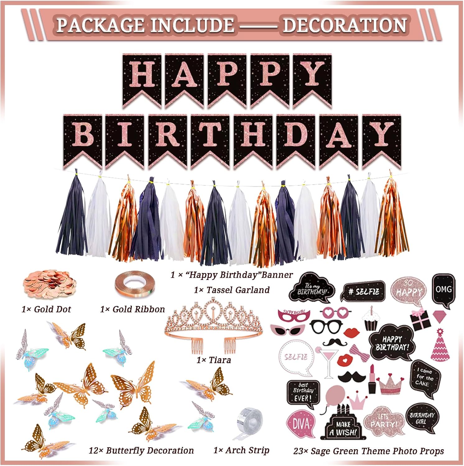 What You Receive - Our 85 pcs happy birthday decorations includes 2 x fringe curtains, 1 x HAPPY BIRTHDAY banner, 8 x Happy Birthday Cake Topper 1 x variety of balloon party kits(32 Pcs), 1 x tiara,23 x Sage Green Theme Photo Props, 1 x tassel garland, 12 x butterfly decors 1 x BIRTHDAY QUEEN sash,1 x ribbon,1 x rose gold dot, 1 x glue dot, 1 x balloon arch strip which enough to meet in your various party needs. Happy Birthday - This birthday party supplies is suitable for both indoor and outdoor party decoration. There are many different but lovely birthday decoration elements, such as balloons, banners, tassel garlands, paper flowers and butterfly decorations, to add atmosphere to your birthday party. Quality - No compromise on quality! Our happy birthday decorations balloons are all made of high-quality materials, small odor, not easy to leak. And each package of our products must undergo strict inspection before leaving the factory. Birthday Party Favors - This birthday decoration set includes background decorations and photo props. It not only makes a striking decoration but also leaves memorable photos for your party. Let's liven up the entire birthday party right away! Service - When products are packed by hand, there might be mistakes or omissions. If you encounter anything you are not satisfied with, please contact us in time and we will do our best to solve it for you.