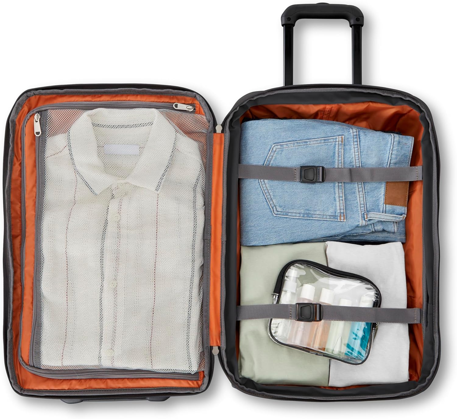 Telescopic handle adjusts to 3 heights Interior zip-around mesh panel pocket Easy access front zip compartment with compression straps and interior mesh zip pocket Expands 1.5 2 front feet for a tip-free design (even when fully packed)