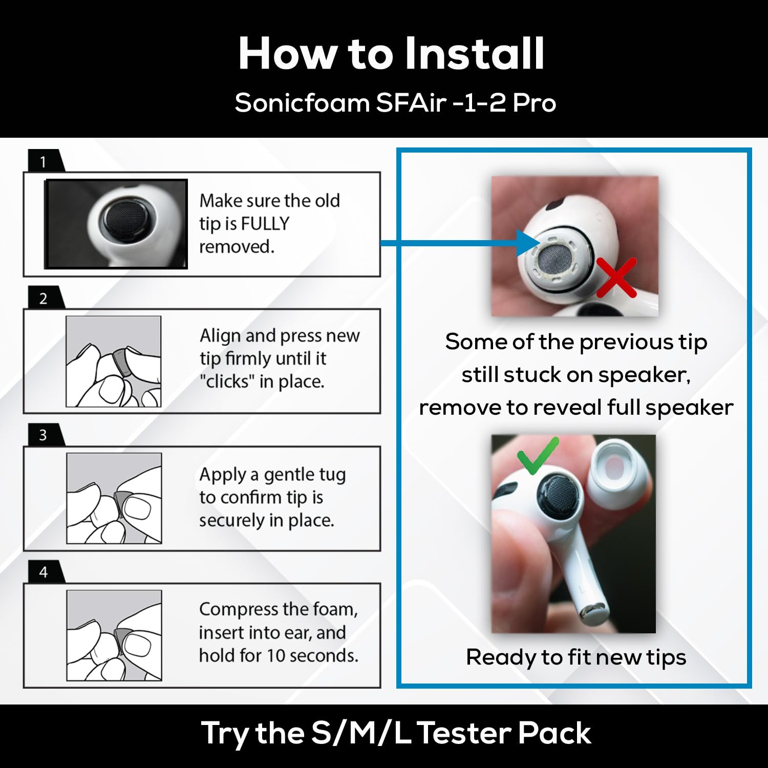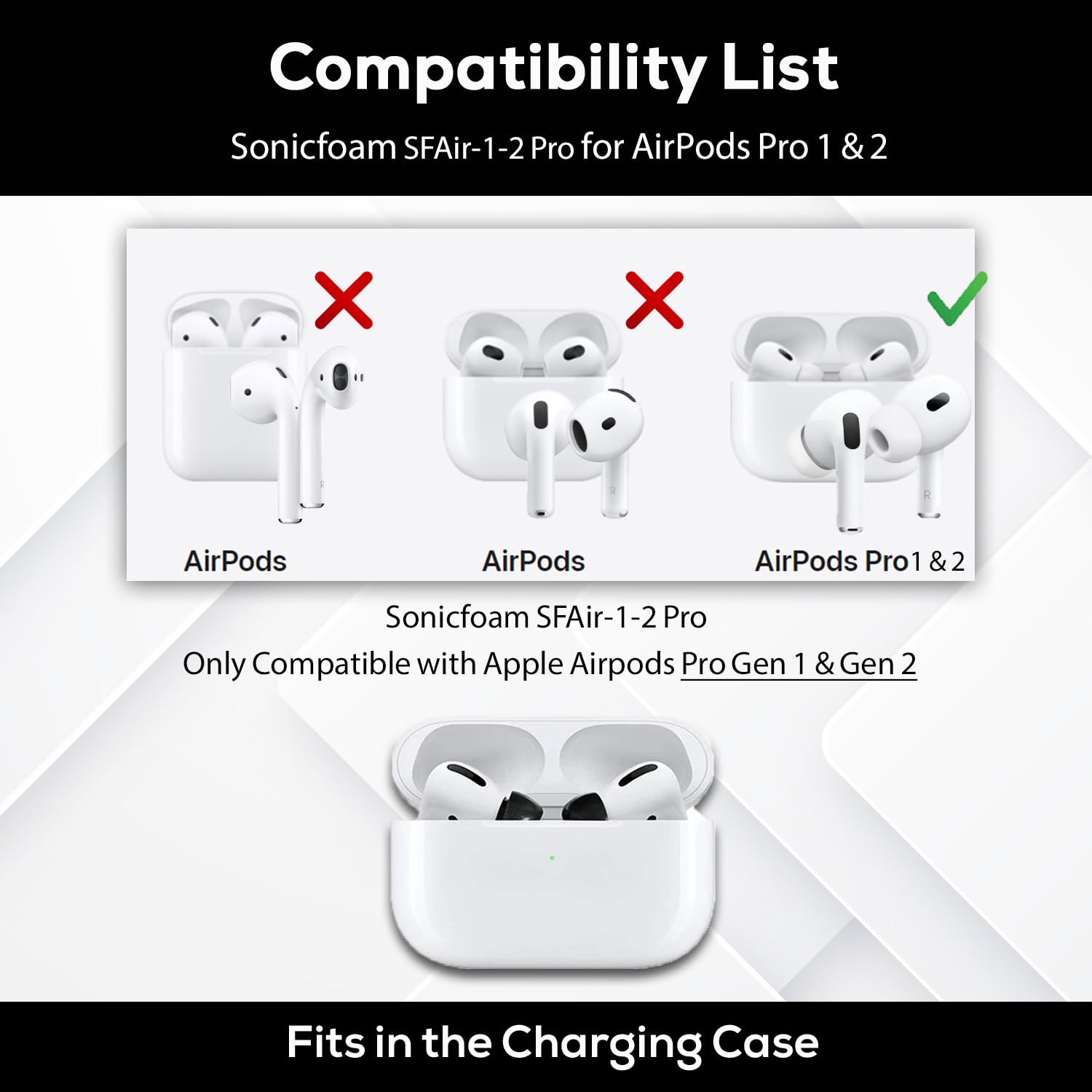 Select an SF model, then view the compatibility list on each SF model to see if your headphone and charging case are compatible with Sonicfoam tips.