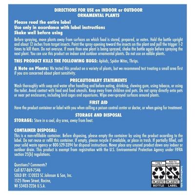 DIRECTIONS FOR USE: Give the bottle a good shake before using. Before spraying, move plants away from surfaces on which food is stored, prepared, or eaten. Hold the bottle upright and about 12 inches away from target insects. Point the spray opening toward the insects on the plant and pull the trigger 1-2 times to kill them. Do not overuse. If more than one plant is being sprayed, shake the bottle again before spraying the next plant. You can use this product on indoor and outdoor ornamental plants. Do not use on edible plants. fWash hands thoroughly with soap and water after handling and before eating, drinking, chewing gum, using tobacco, or using the toilet. Avoid contact with food and food utensils. WARNINGS: PRECAUTIONARY STATEMENTSWash thoroughly with soap and water after handling and beforeeating, drinking, chewing gum, using tobacco, or using the toilet.Avoid contact with food and food utensils.INGREDIENTS: Active Cedarwood Oil 4.0%, Sodium Lauryl Sulfate 0.15%, other ingredients 95.85%, Total 100%. Highlights: Bug spray for plants that effectively eliminates garden pests without harming plants; kills bugs like aphids, spider mites and thrips Family friendly garden and house plant bug spray that s safe for use around people and pets (when used as directed) Water-based STEM insecticide that uses a botanical extract derived from cedarwood to effectively kill bugs that feed on ornamental garden and house plants Entomologist-tested insect spray for plants, featuring a fresh scent and containing no added dye or harsh chemical odors Rooted in Nature, Optimized by Science Specifications: Weight: .9 Pounds Product Warning: Wash hands with soap and water after handling, wash hands with soap and water before handling, do not ingest Indoor/Outdoor: Indoor, Outdoor Treats and/or Prevents Against: Spider Mites, Thrips, Aphids Formulation: Kills Pests Product Form: Liquid Active Ingredient(s): Cedarwood Oil 4% , Sodium Lauryl Sulfate .15% Package Quantity: 1 Application Type: Pump Spray