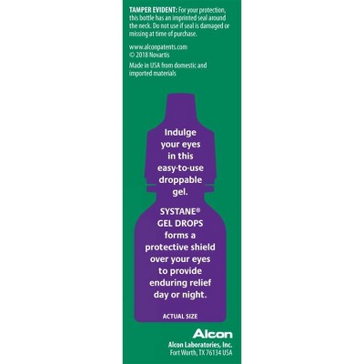 Systane Gel Drops Lubricant Eye Gel provides long-lasting relief from severe dry eye symptoms. This thick gel formula is designed to create a protective shield over the eye, offering maximum moisture retention and soothing comfort. Ideal for overnight use or for those experiencing persistent dry eye discomfort, Systane Gel Drops offer hydration and protection. Highlights: Dry Eye Relief: Systane Gel Drops Lubricant Eye Gel provides soothing and long-lasting relief for dry eye symptoms when contacts are not in eye. Thick Gel Formula: Forms a protective shield over the eye, ensuring moisture retention and soothing comfort. Ideal for Severe Dry Eye: Perfect for overnight use or for those with persistent dry eye discomfort, delivering hydration and protection. Long-Lasting Hydration: Provides enduring relief to soothe and protect your eyes from dry eye discomfort. Trusted Brand: Systane is a trusted name in eye care, recommended by eye care professionals for its effective and reliable relief. Convenient Size: The 10mL fl oz bottle is easy to carry and use, providing convenient relief wherever you need it. Specifications: Suggested Age: All Ages Health Facts: Dye-Free Product Form: Drops Primary Active Ingredient: Propylene Glycol Package Quantity: 1 Contact Lens Type: Not Recommended for Contacts Net weight: .33 fl oz (US)