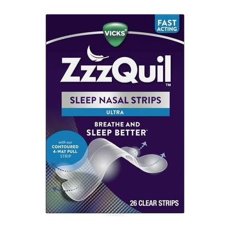 BREATHE BETTER, SLEEP BETTER: Vicks ZzzQuil Sleep Nasal Strips, Clear Nighttime Nasal Strips for Snoring instantly relieves nasal congestion to improve breathing, snoring and provide sleep support, so you can wake up refreshed CONTOURED 4-WAY PULL DESIGN: This clear nasal strip features a 4-point pull design, which instantly opens your nose for all-night sleep support, easier breathing and reduced snoring WORKS ALL NIGHT: ZzzQuil Sleep anti snoring device nasal strips have gentle adhesion with maximum staying power, so they stay on through the night COMFORTABLE FIT: Better fit and comfort for a great night's sleep SAFE FOR NIGHTLY USE^: ZzzQuil Sleep Nasal Strips are a drug-free, unscented, snoring solution and safe for nightly use.^ EASY TO APPLY & IRRITATION-FREE REMOVAL. Easy to use anti-snoring nasal strips for sleep support and easier breathing. 26 Clear Nasal Strips
