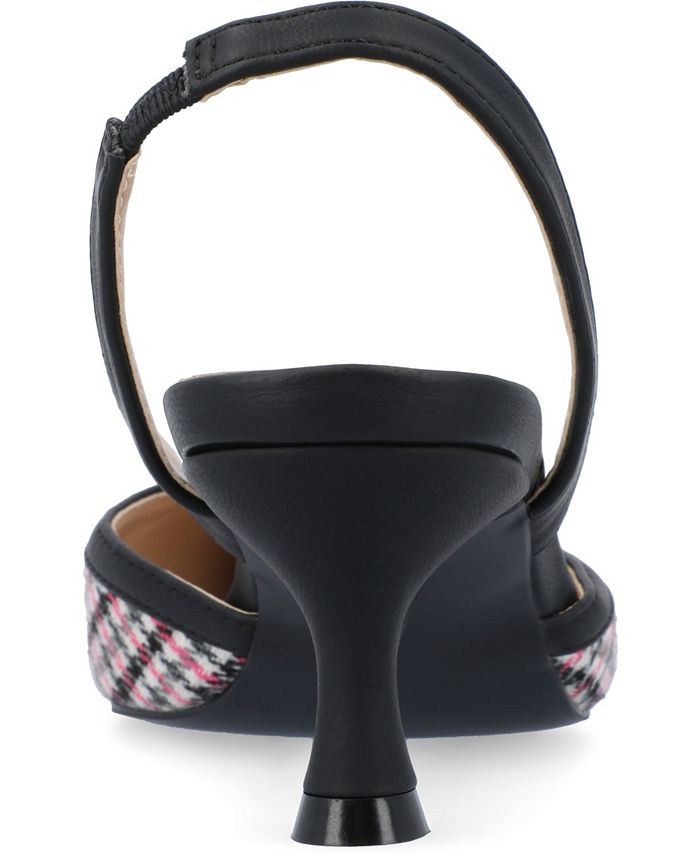 An iconic silhouette topped with vintage details, the Nellia heel by Journee Collection. This darling kitten heel features houndstooth printed fabric contrasted with luxe faux leather accents for a retro look. A stretchable slingback strap holds you in place, and a padded insole cushions your step. Heel height- 2, kitten heel. Shoe width- medium. Entry details- pull-on. Footbed- padded. Faux leather, fabric upper, manmade lining and outsole. Toe style- pointed. All measurements are approximate and were taken using a size 6. Please note measurements may vary slightly by size. Our styles will let you go from a fun night out with the girls to kicking back and relaxing at the end of the night without any trouble. Upper- Faux Leather- Polyurethane and Fabric- Knit, Lining- Faux Leather. Spot Clean. Imported
