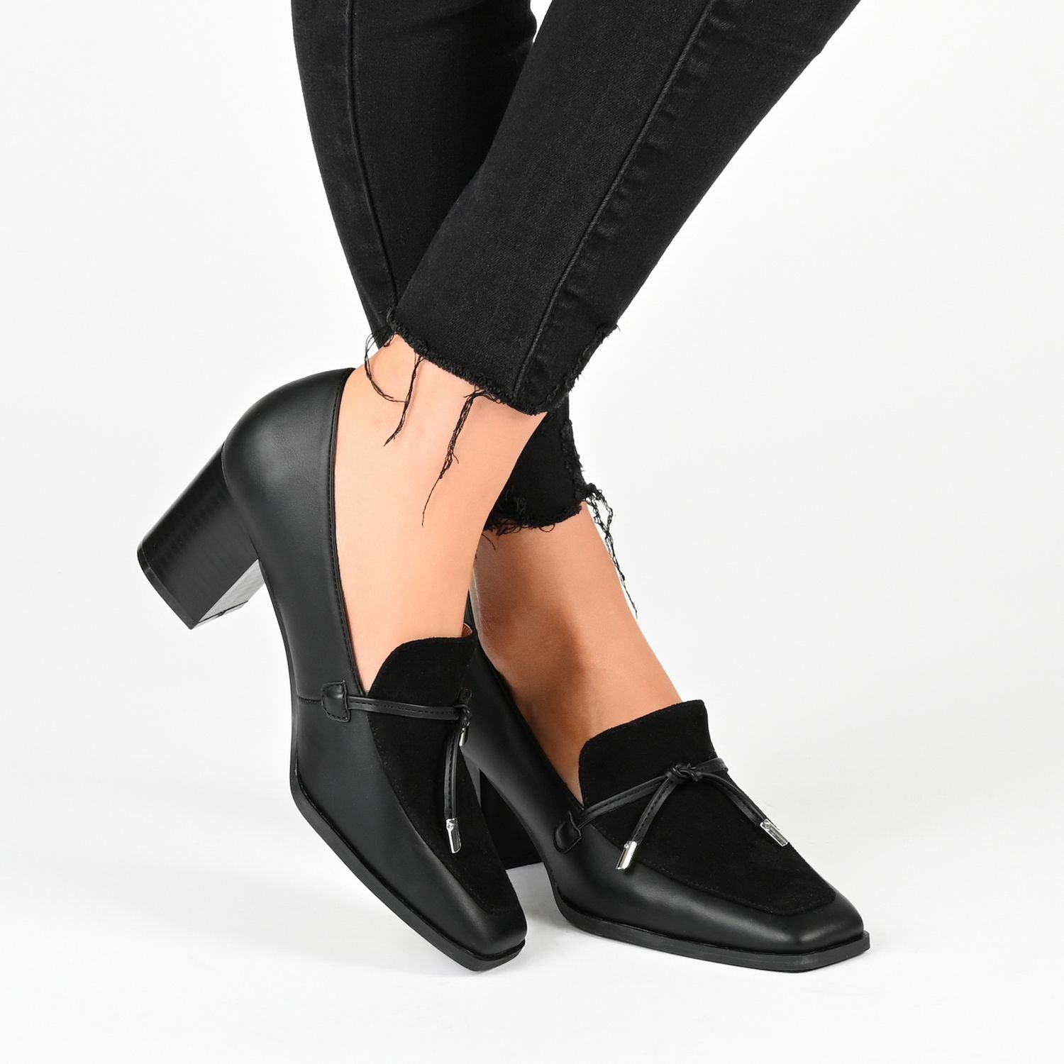 These Journee Collection Crawford Tru Comfort Foam women's loafer pumps are perfect for the office. SHOE FEATURES Tie detail Mixed material upper Comfortable Tru Comfort Foam footbed Stacked block heel SHOE CONSTRUCTION Faux leather, faux suede upper Fabric lining Manmade outsole SHOE DETAILS Square toe Slip-on Foam footbed 2.5-in. heel