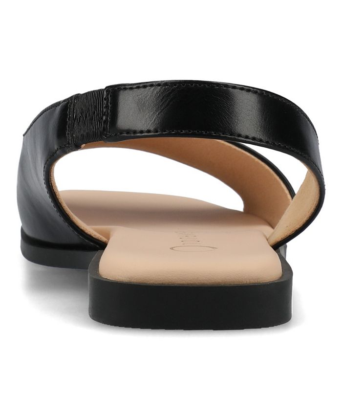 Enjoy effortless style with the Brinsley sandals from Journee Collection, featuring a comfortable flat sole and an easy pull-on closure. These sandals showcase an open toe and an ankle strap, adding a touch of casual elegance to your look. It ensures both comfort and style, making the Brinsley flat sandal a versatile and chic choice for everyday wear. Square toe. Slingback with pull on closure. Heel type: Flat heel. Comfort footbed. Upper and Lining: Polyurethane; Outsole: Man made. Spot clean. Imported
