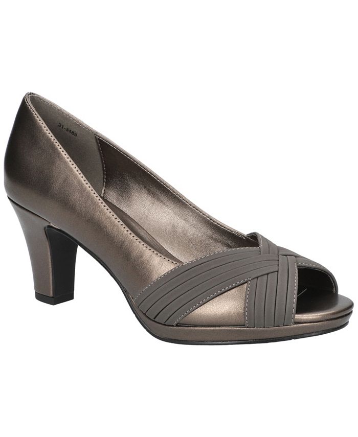Step into elegance with the contemporary Lavish platform peep-toe pump by Easy Street. Adorned with an on-trend multi-material strip overlay. Offered many options for every day and evening events. The contemporary dress heel and padded insole offer lasting all-day comfort. Lavish is an ideal choice for all dress occasions. Peep toe. Fashionable platform. 2.25 Dress heel. Available in narrow, medium, wide and extra wide widths. Slip-on closure. Manmade upper; Manmade lining; Rubber outsole. Spot Clean. Imported