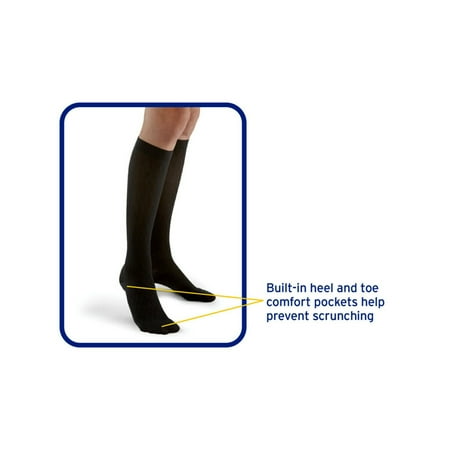 Moderate Compression (15-20 mm/Hg) Designed with graduated compression to help Improve blood flow and minimize swelling in the legs Helps prevent swelling (edema) and deep vein thrombosis (DVT) for long distance travelers Great for standing or sitting all day, traveling, or activity around the office Great for business casual or weekend wear Made with a fashionable diamond pattern Stylish, wide band holds socks in place Built-in heel and toe comfort pockets help prevent scrunching Made from a soft, comfortable blend of nylon and spandex Hand wash Color: Black